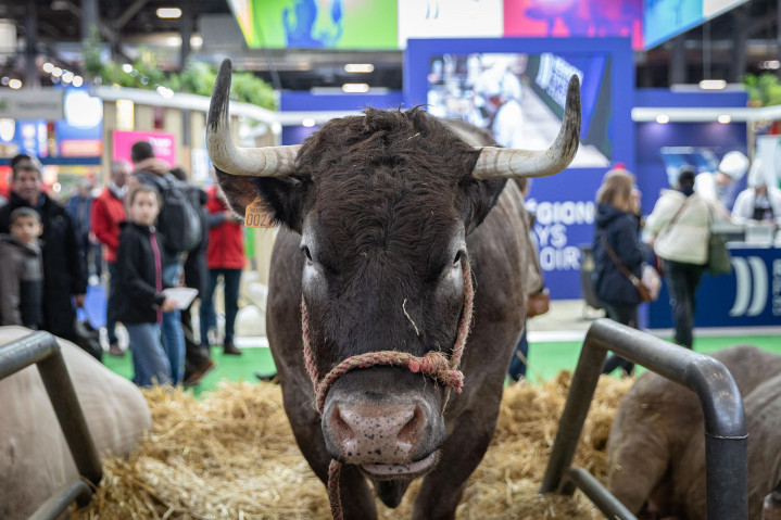 这是2024年2月26日在法国巴黎凡尔赛门展览中心举行的第60届法国国际农业博览会上拍摄的牛。新华社发(奥雷利安·莫里萨尔摄)